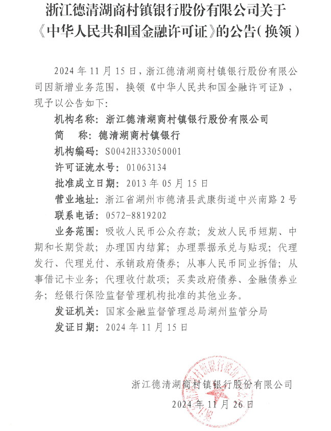 浙江德清湖商村镇银行股份有限公司关于《中华人民共和国金融许可证》的公告(换领)