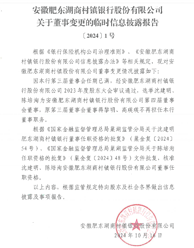 安徽肥东湖商村镇银行股份有限公司关于董事变更的临时信息披露报告