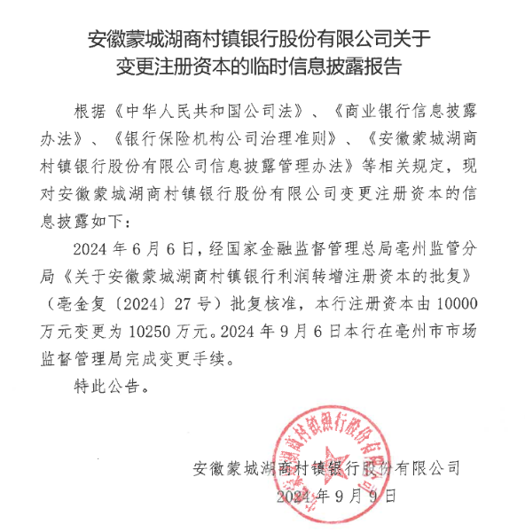 安徽蒙城湖商村镇银行股份有限公司关于变更注册资本的临时信息披露报告