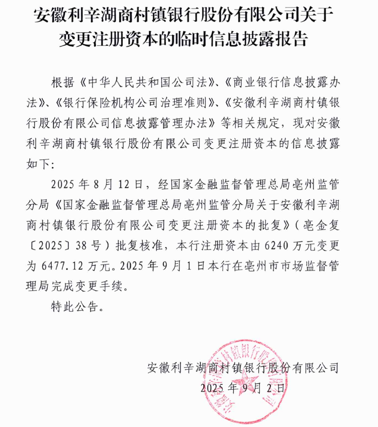 安徽利辛湖商村镇银行股份有限公司关于变更注册资本的临时信息披露报告