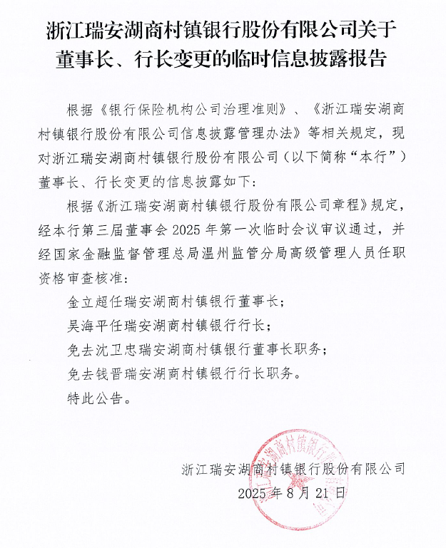 浙江瑞安湖商村镇银行股份有限公司关于董事长、行长变更的临时信息披露报告