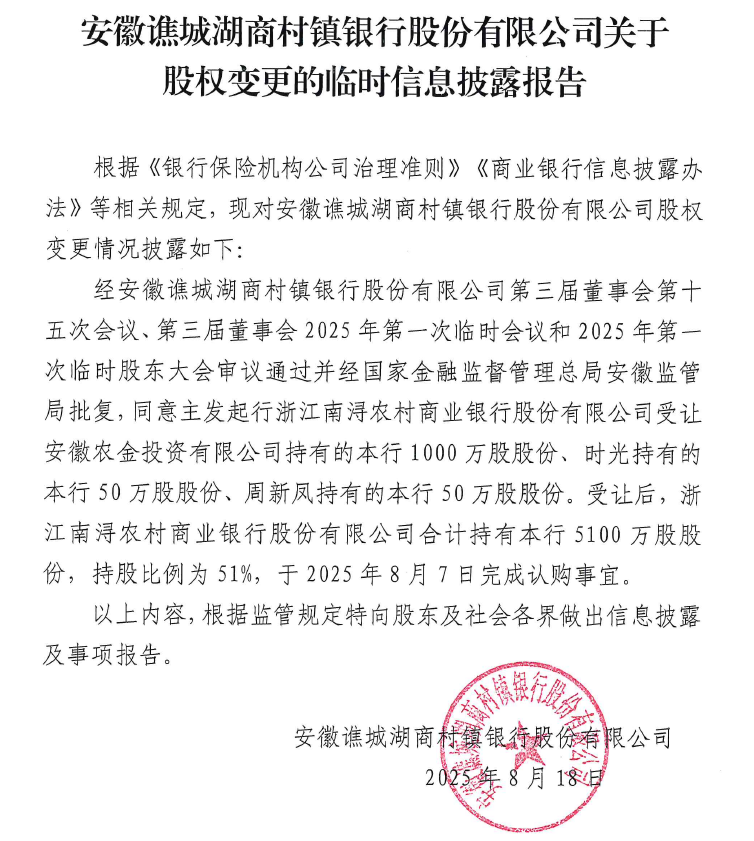 安徽谯城湖商村镇银行股份有限公司关于股权变更的临时信息披露报告