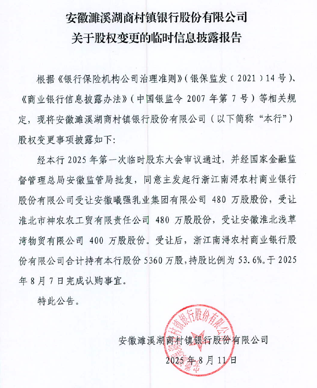 安徽濉溪湖商村镇银行股份有限公司关于股权变更的临时信息披露报告