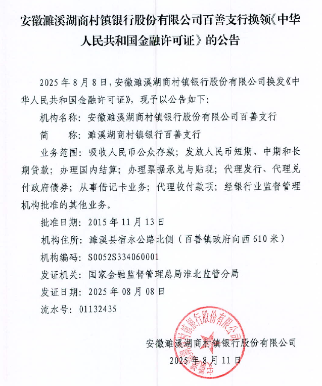安徽濉溪湖商村镇银行股份有限公司百善支行换领《中华人民共和国金融许可证》的公告