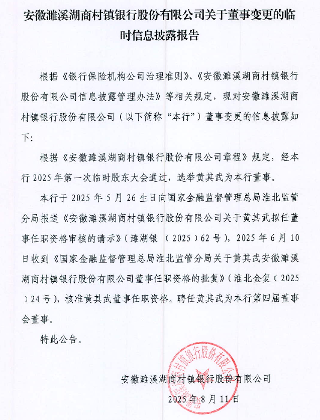 安徽濉溪湖商村镇银行股份有限公司关于董事变更的临时信息披露报告
