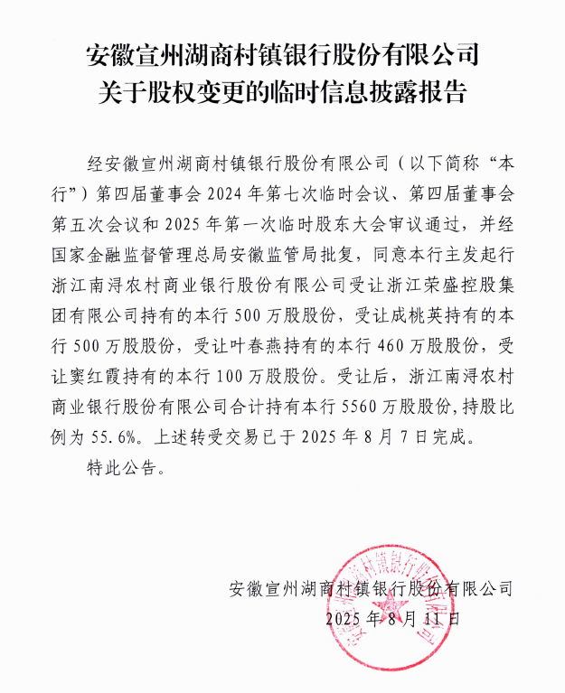 安徽宣州湖商村镇银行股份有限公司关于股权变更的临时信息披露报告