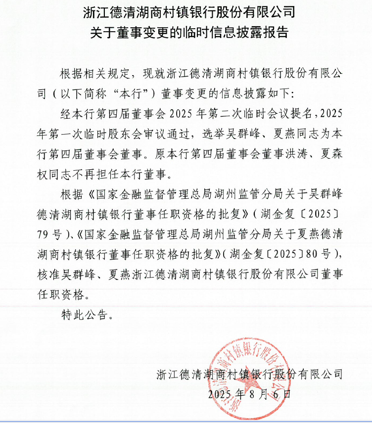 浙江德清湖商村镇银行股份有限公司关于董事变更的临时信息披露报告