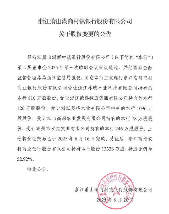 浙江萧山湖商村镇银行股份有限公司关于股权变更的公告