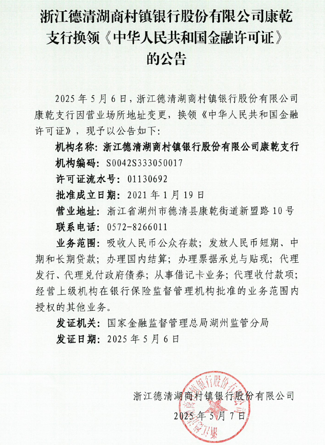 浙江德清湖商村镇银行股份有限公司康乾支行换领《中华人民共和国金融许可证》的公告