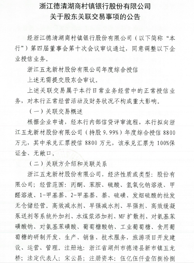 浙江德清湖商村镇银行股份有限公司关于股东关联交易事项的公告