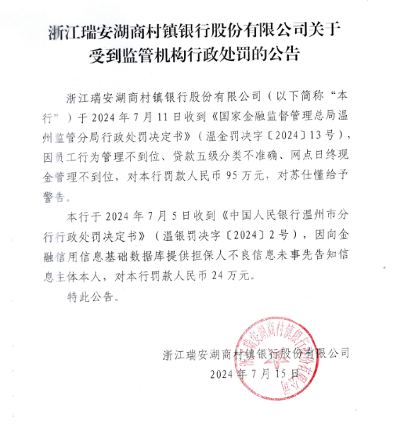 浙江瑞安湖商村镇银行股份有限公司关于受到监管机构行政处罚的公告