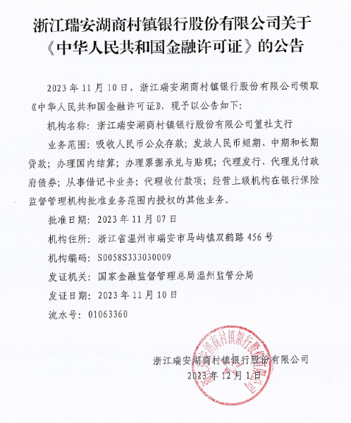 浙江瑞安湖商村镇银行股份有限公司关于《中华人民共和国金融许可证》的公告(篁社支行)