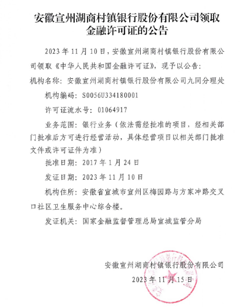 安徽宣州湖商村镇银行股份有限公司 领取金融许可证的公告