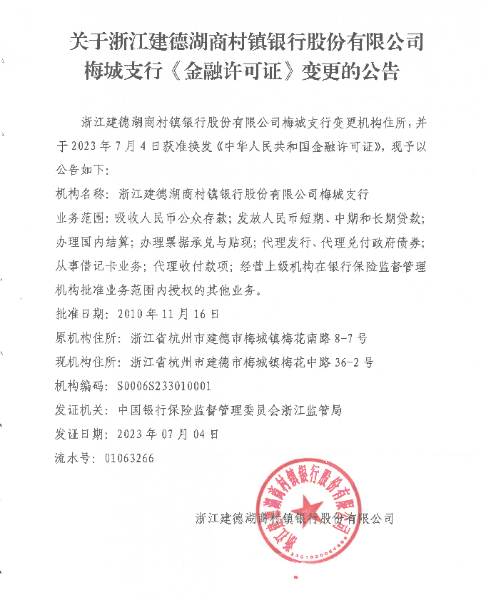 关于浙江建德湖商村镇银行股份有限公司梅城支行《金融许可证》变更的公告