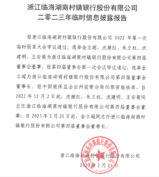浙江临海湖商村镇银行二零二三年临时信息披露报告