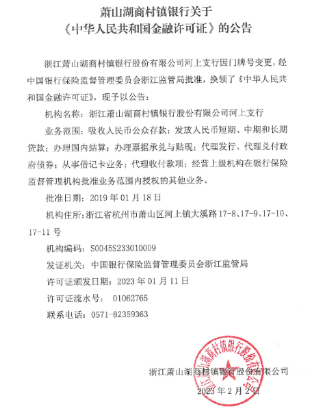 萧山湖商村镇银行关于《中华人民共和国金融许可证》的公告-河上支行