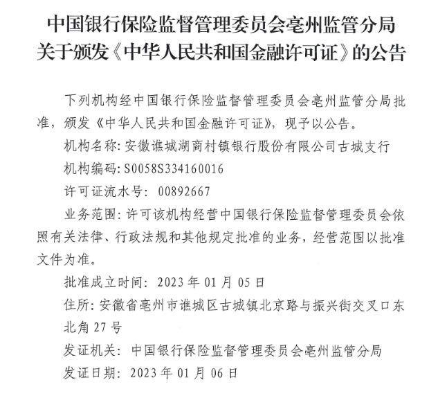 蒙城湖商村镇银行换领金融许可证公告...