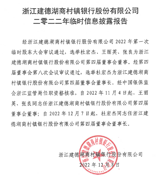 浙江建德湖商村镇银行股份有限公司二O二二年临时信息披露报告