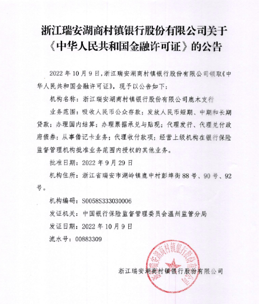浙江瑞安湖商村镇银行股份有限公司关于《中华人民共和国金融许可证》的公告