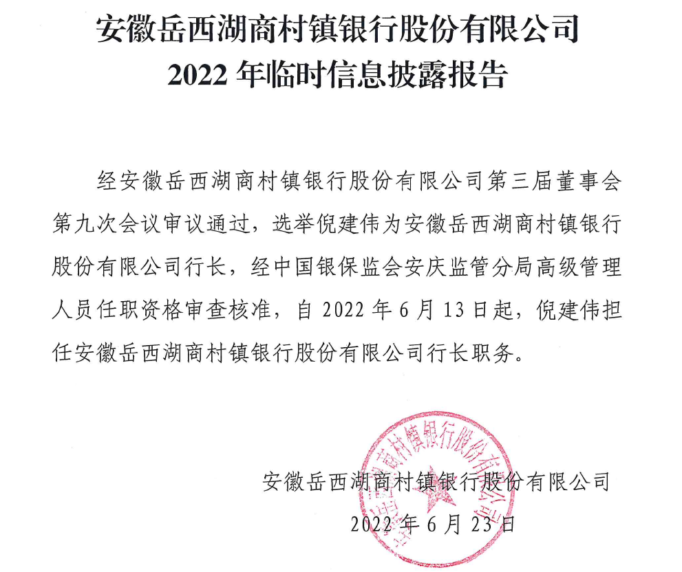 安徽岳西湖商村镇银行股份有限公司2022年临时信息披露报告