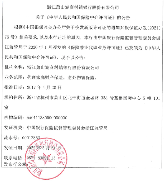 浙江萧山湖商村镇银行关于《中华人民共和国保险中介许可证》的公告