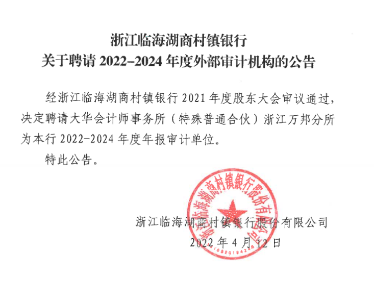 浙江临海湖商村镇银行关于聘请2022-2024年度外部审计机构的公告