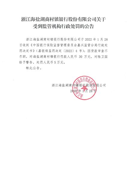 浙江海盐湖商村镇银行股份有限公司关于受到监管机构行政处罚的公告