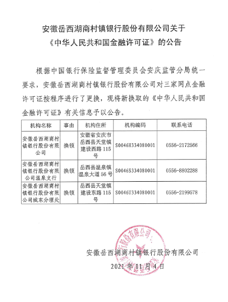 安徽岳西湖商村镇银行股份有限公司关于《中华人民共和国金融许可证》的公告