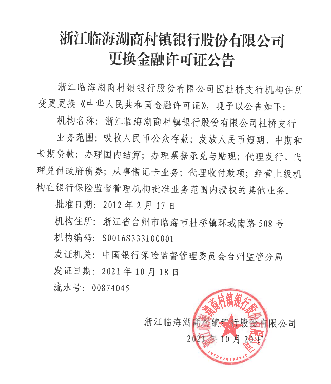 浙江临海湖商村镇银行股份有限公司金融许可证公示--杜桥支行换证