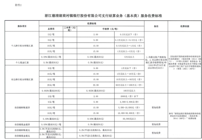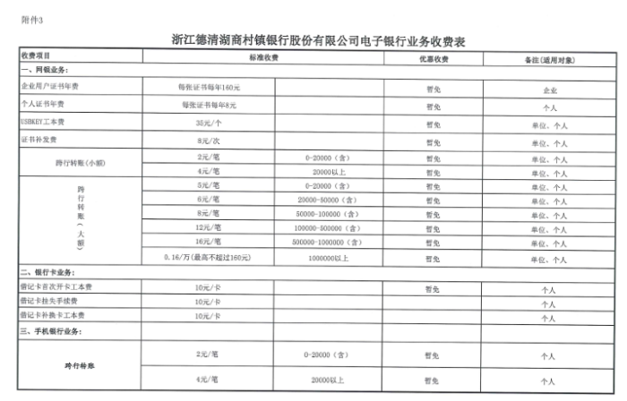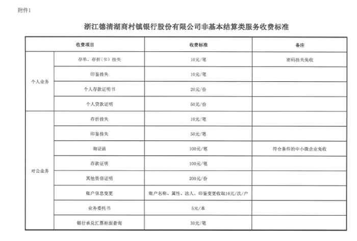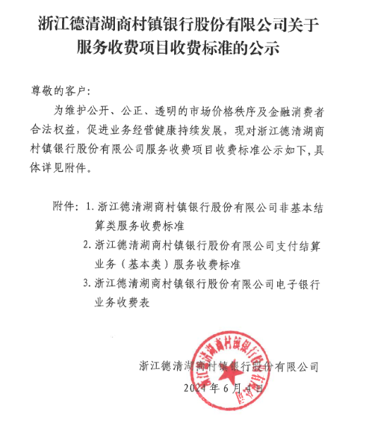 浙江德清湖商村镇银行股份有限公司关于服务收费项目收费标准的公示20240604
