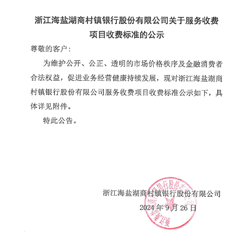 浙江海盐湖商村镇银行股份有限公司非基本结算类服务收费标准 |