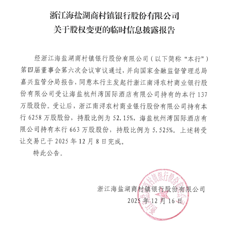 浙江海盐湖商村镇银行关于股权变更的临时信息披露报告