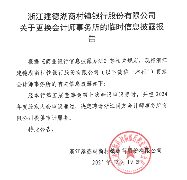 浙江德清湖商村镇银行关于聘请2025-2027年度外部审计机构的公告