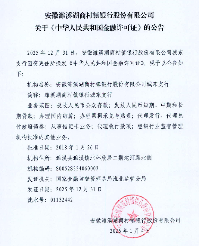 安徽濉溪湖商村镇银行股份有限公司关于《中华人民共和国金融许可证》公告(城东支行)