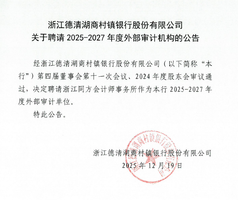 浙江德清湖商村镇银行关于聘请2025-2027年度外部审计机构的公告