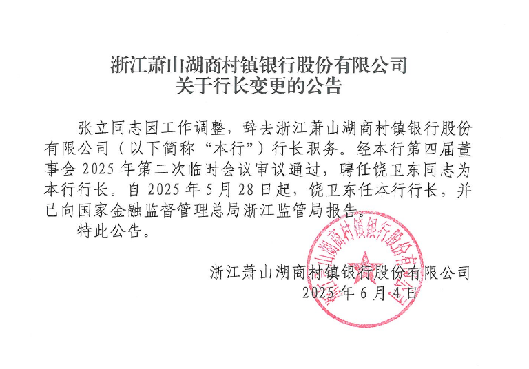 浙江萧山湖商村镇银行股份有限公司关于行长变更的公告