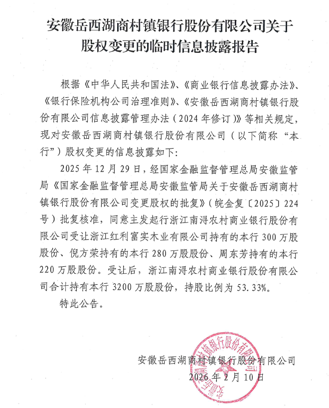 安徽岳西湖商村镇银行关于股权变更的临时信息披露报告